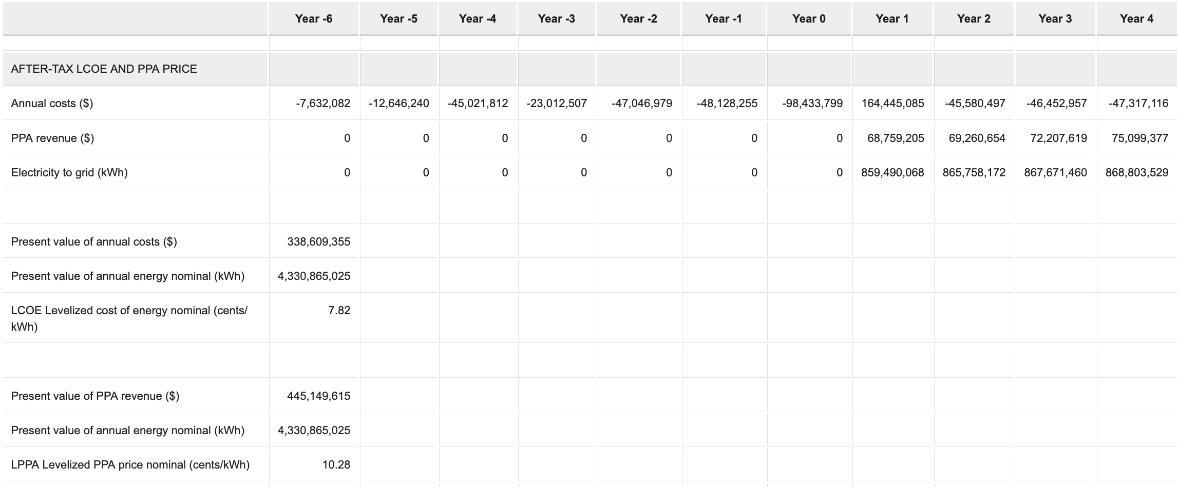 Line items in the AFTER-TAX LCOE AND PPA PRICE category are post-processed to yield timeline-adjusted LCOE and LPPA.