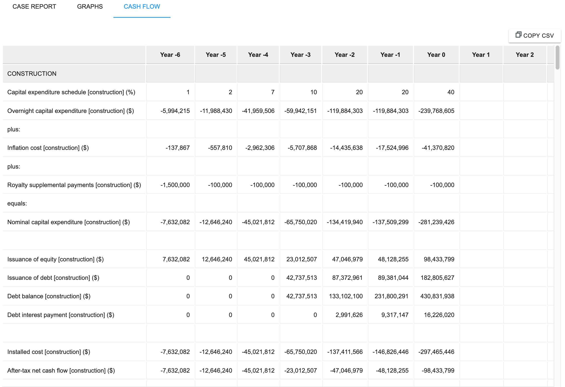Royalty Supplemental Payments[1] scheduled during the construction phase are applied as an additional capital cost for the year. This ensures that pre-revenue site control costs (such as option payments or land leases) are properly capitalized into the project basis.Debt & Equity Draws: Costs are covered by issuance of equity and debt based on
