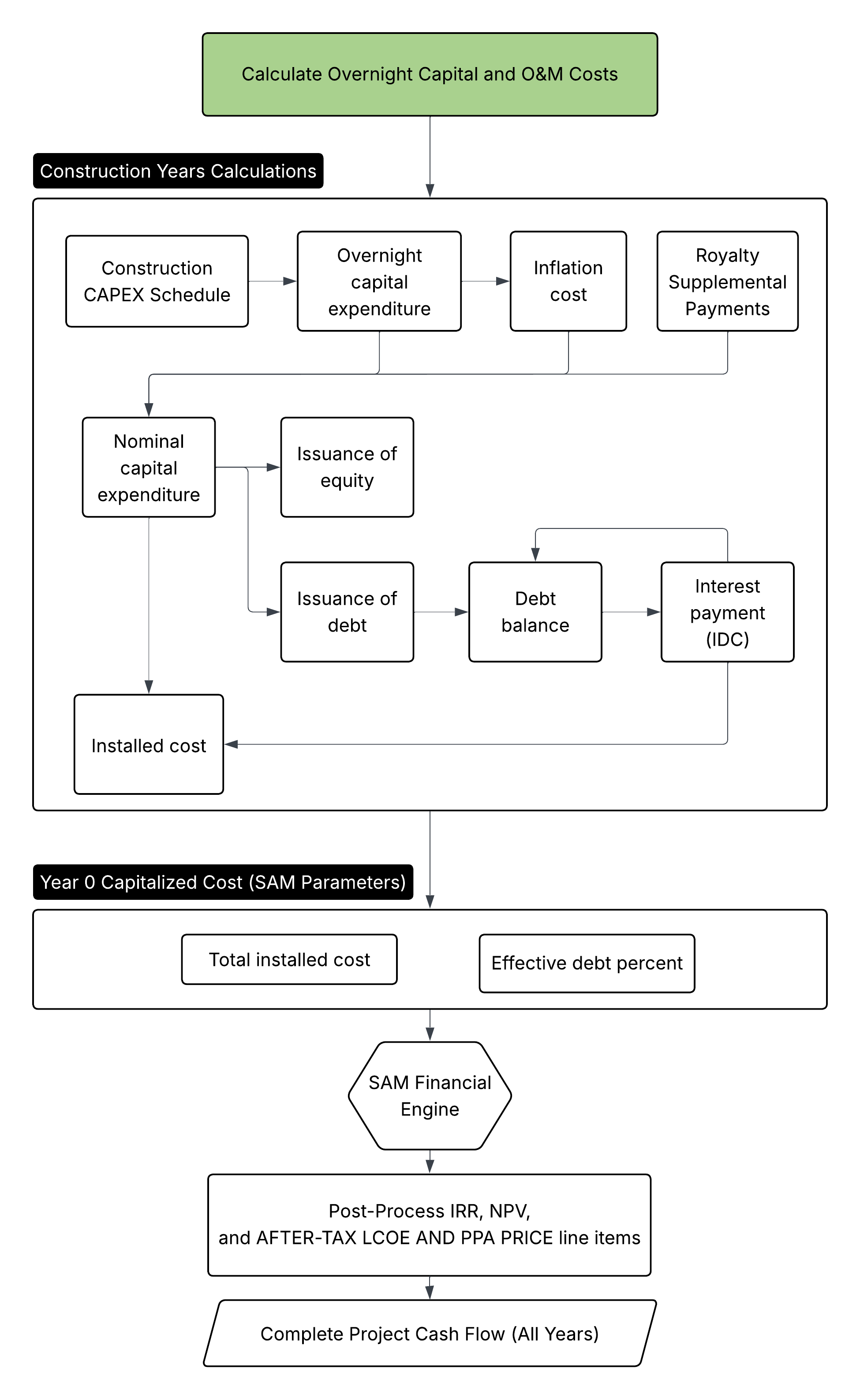 At the end of the construction phase, total installed cost and effective debt percentage are passed to the SAM financial